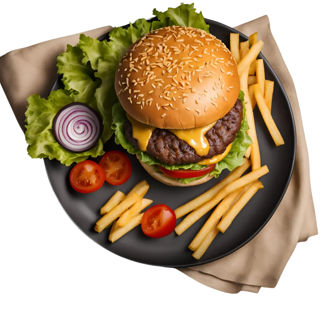 Saftiger Cheeseburger mit Tomaten, Gewürzgurken, Zwiebeln, Salat, Ketchup und geschmolzenem Käse, serviert mit knusprigen Pommes.