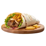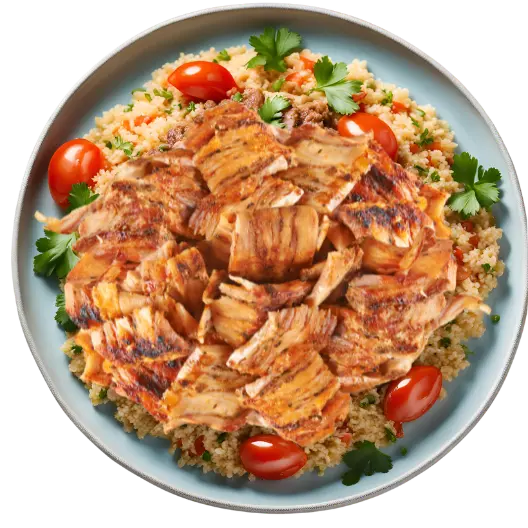 Ein Teller mit saftigem Drehspießfleisch, serviert mit würzigem Bulgur und frischem Salat.