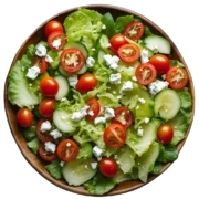 Traditioneller Salat mit Eisbergsalat, Tomaten, Gurken, Zitrone, Zwiebeln, Olivenöl, geröstetem Brot und Granatapfelsauce.