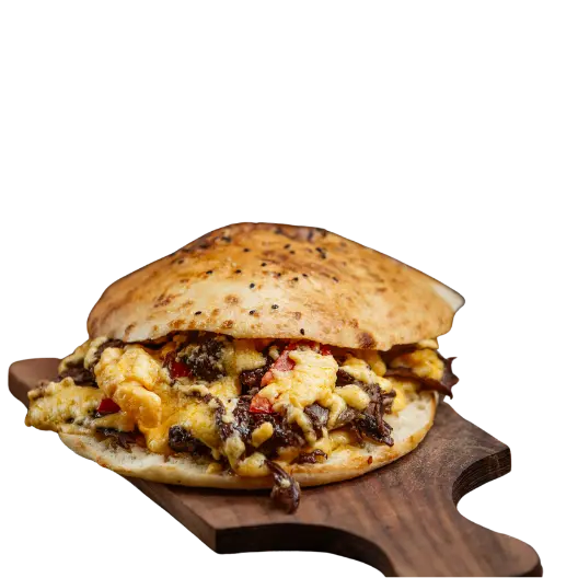 Drehspießfleisch mit zusätzlichen Toppings im ofenfrischen Fladenbrot, garniert mit Salat und Sauce.